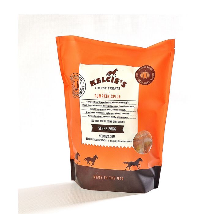 Kelcies Pumpkin Spice Horse Treats are low in sugar, starch, and carbohydrates. Each batch is crafted using locally-sourced, natural ingredients.Pumpkin Spice Horse Treats are manufactured using a unique extrusion process which creates a specific density and shape designed for optimal digestion and nutrition absorption. This extrusion process also decreases moisture and prevents mold growth. This enables our bags to have a longer shelf life, although your horse will likely eat the entire bag long before.