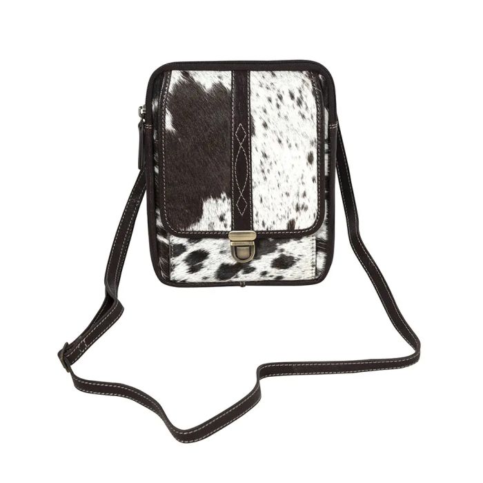 This lovely bag is just the right size when you’re on the go. The top flap snaps closed, while the interior has a zipper close top.